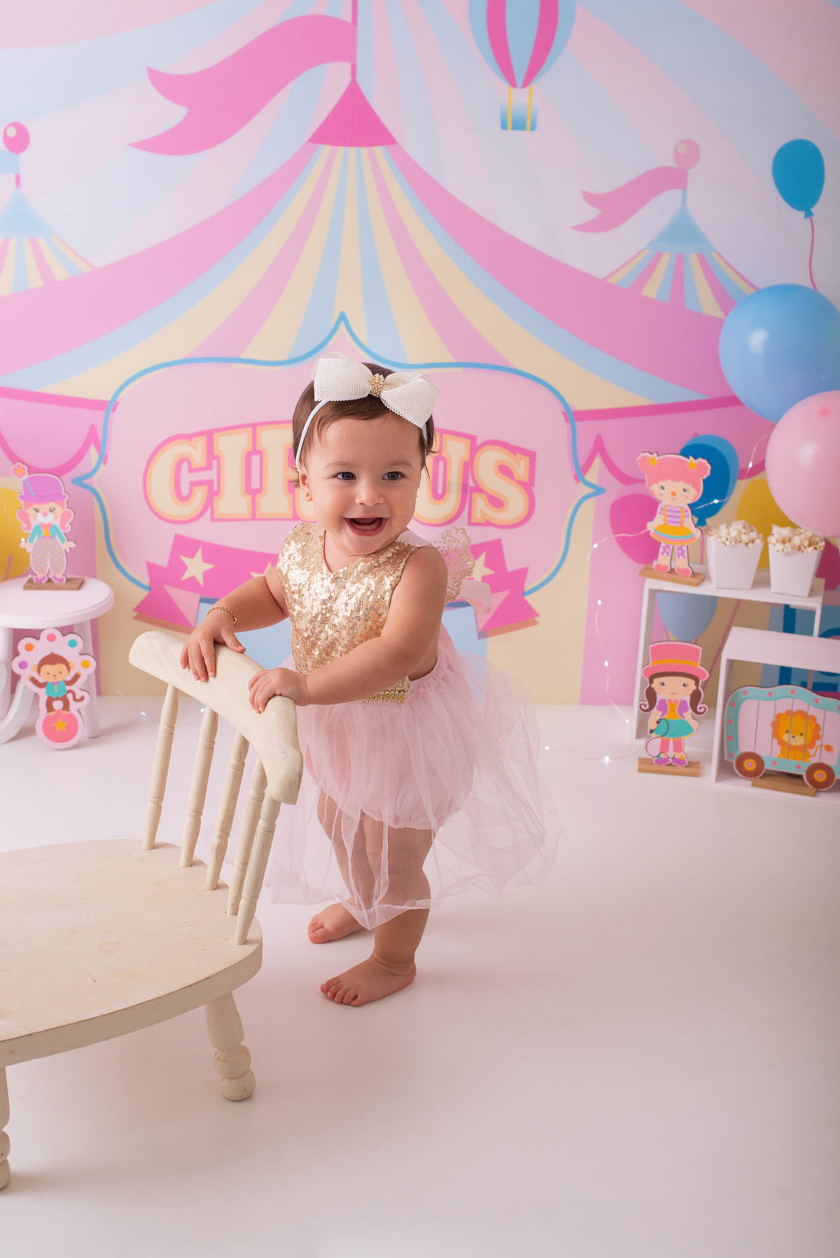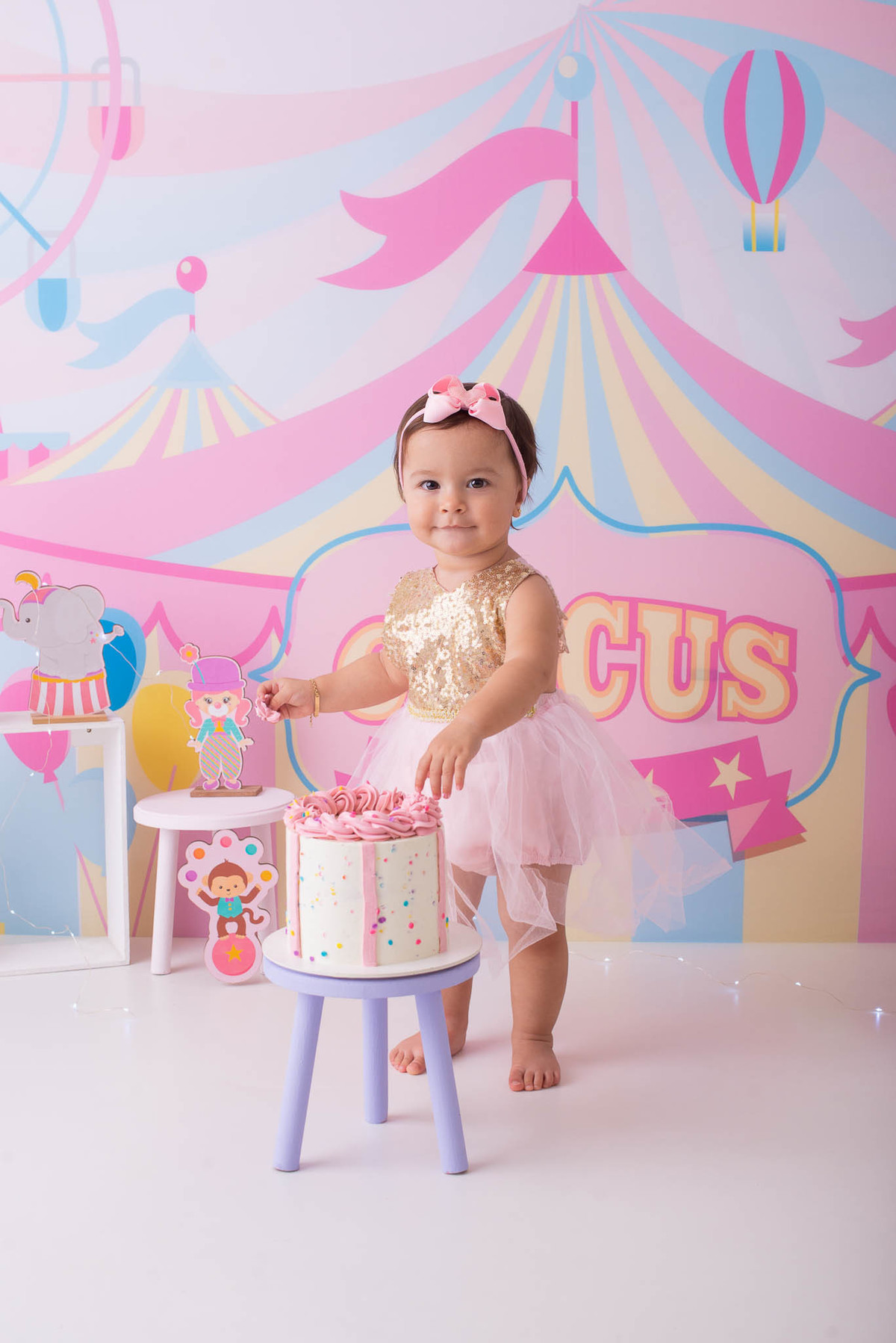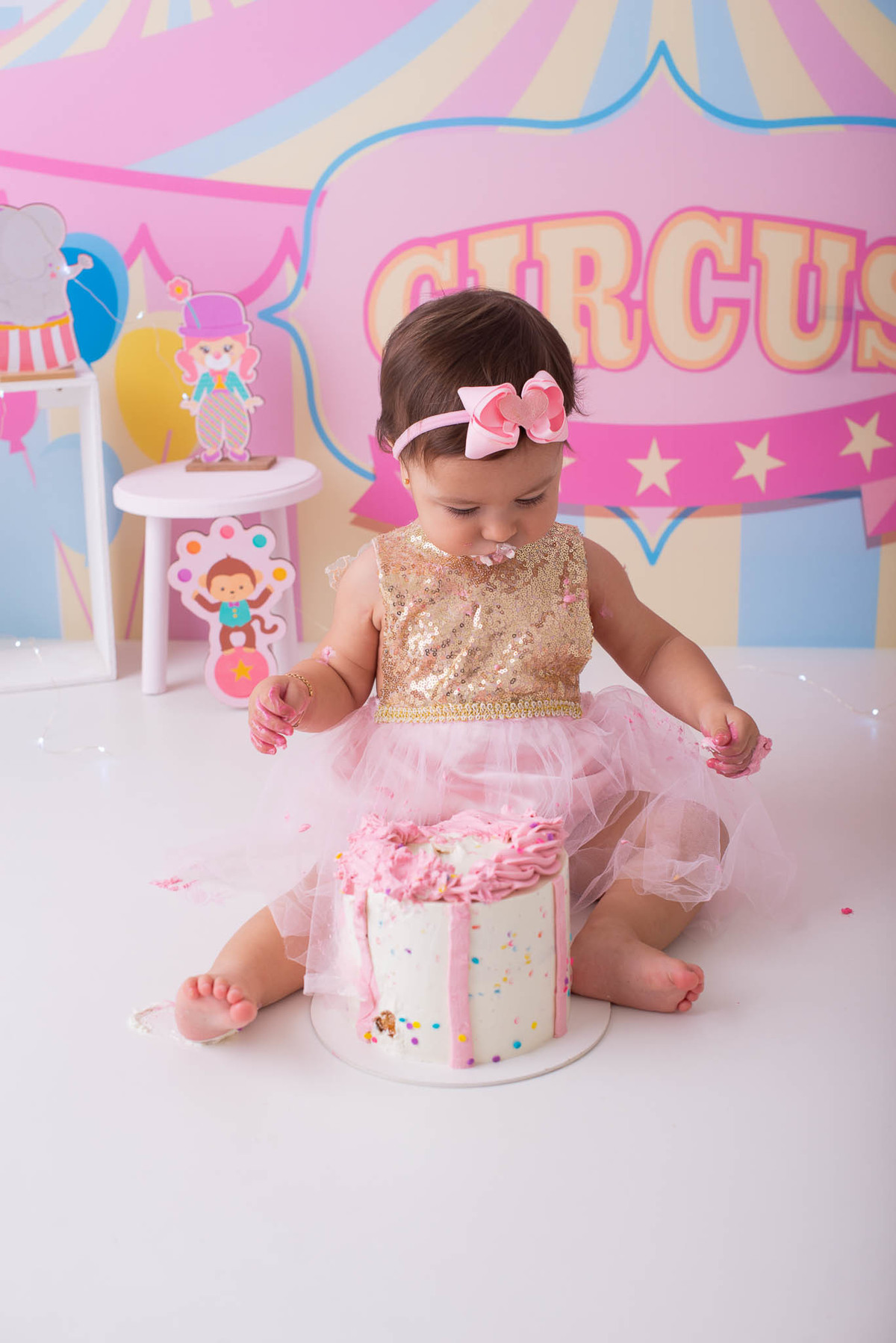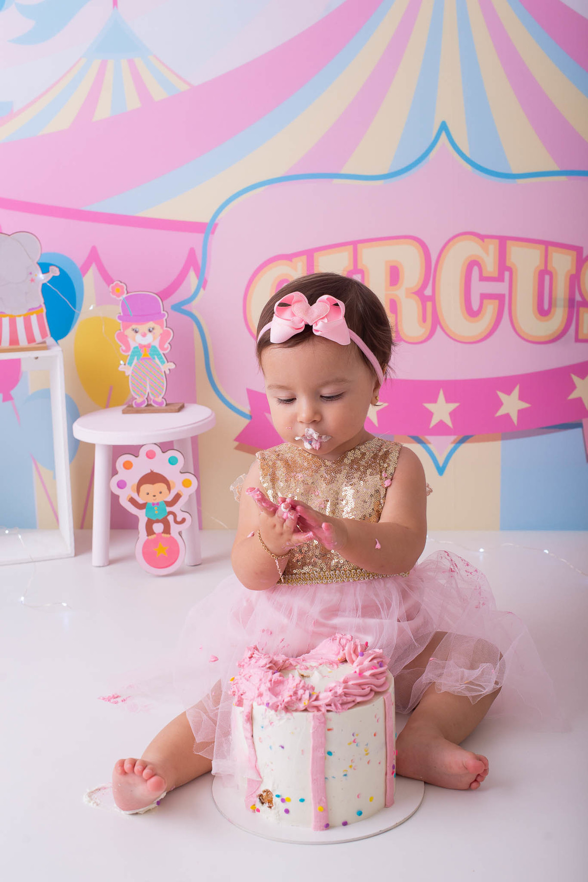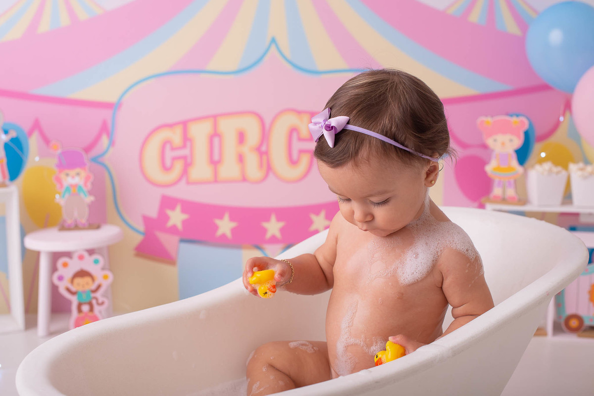 O ensaio fotográfico de 1 ano se chama Smash the caker, a mamãe da Maitê escolheu o tema circo rosa, aqui no estúdio oferecemos o cenário, o figurino e o bolo, também fazemos fotos do bebê com a família, e depois do bolo tem o banho, geralmente esse ensaio leva 1h, os irmãos são muito bem vindos no nosso estúdio e são tratados com muito carinho, o resultado são fotos linda de muita qualidade, uma recordação para a vida toda.